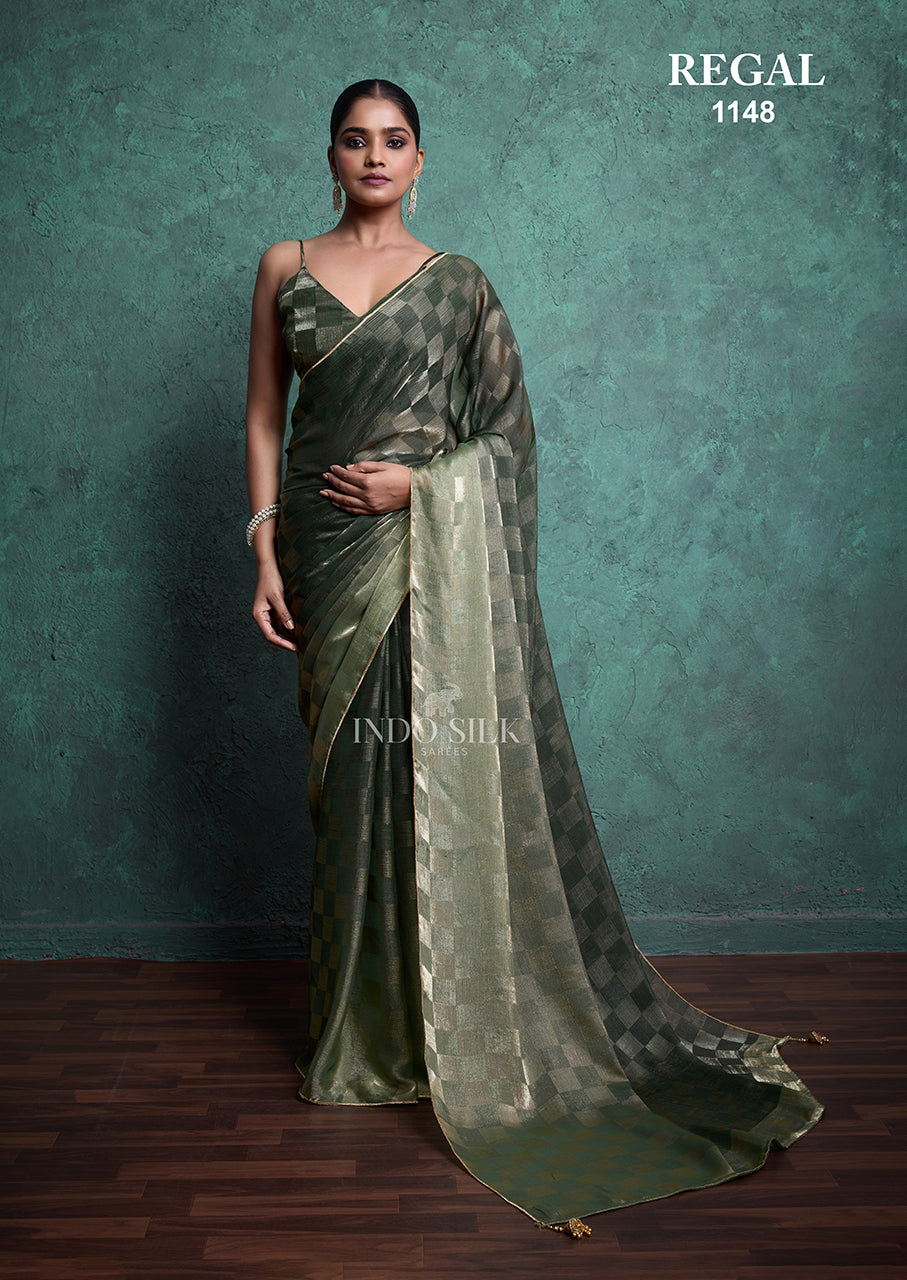 Exude grace and sophistication with the Regal 1148 Green Fendy Satin Chex Saree from Indo Silk Sarees. Designed in premium Fendy Satin Chex fabric, this saree features a rich green shade with a subtle checkered weave, highlighted by a glossy satin finish. Its elegant flow and modern appeal make it a versatile choice for weddings, festive occasions, receptions, and parties.